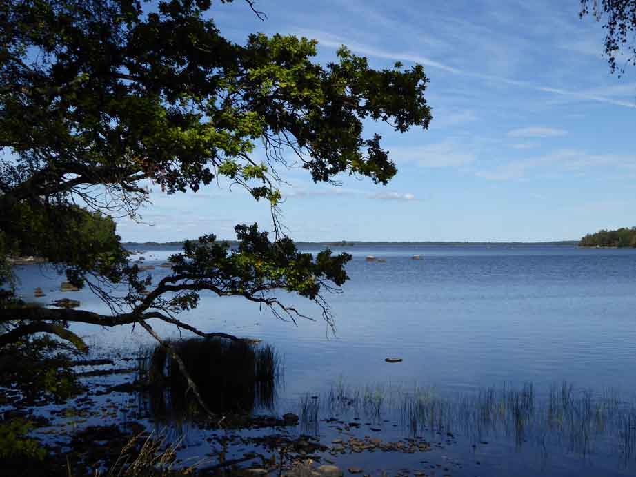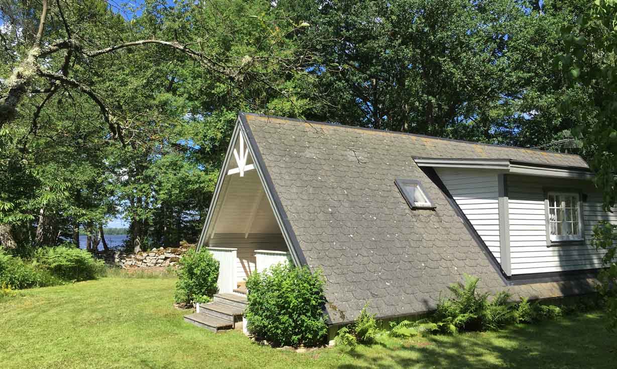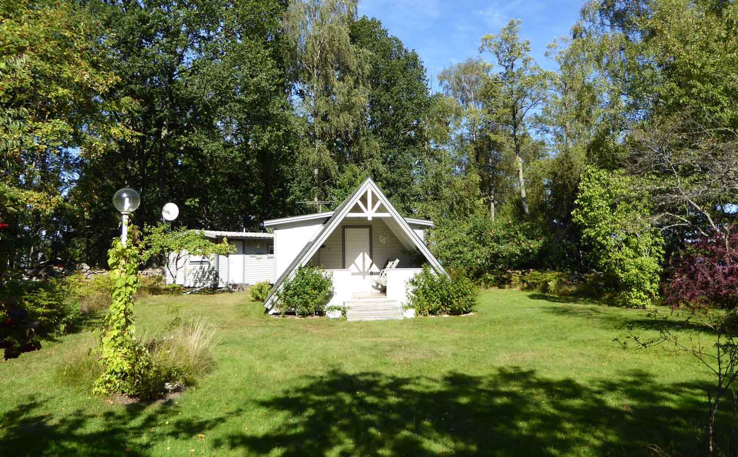 Tomten är stor och grönskande med gräsmatta, stenmurar och grillplats. Här finns trädgårdsmöbler, grill och gott om plats att njuta av både sol och skugga. Läget är soligt, tyst och skyddat från vindarna från sjön – en verklig pärla för den som vill koppla av.